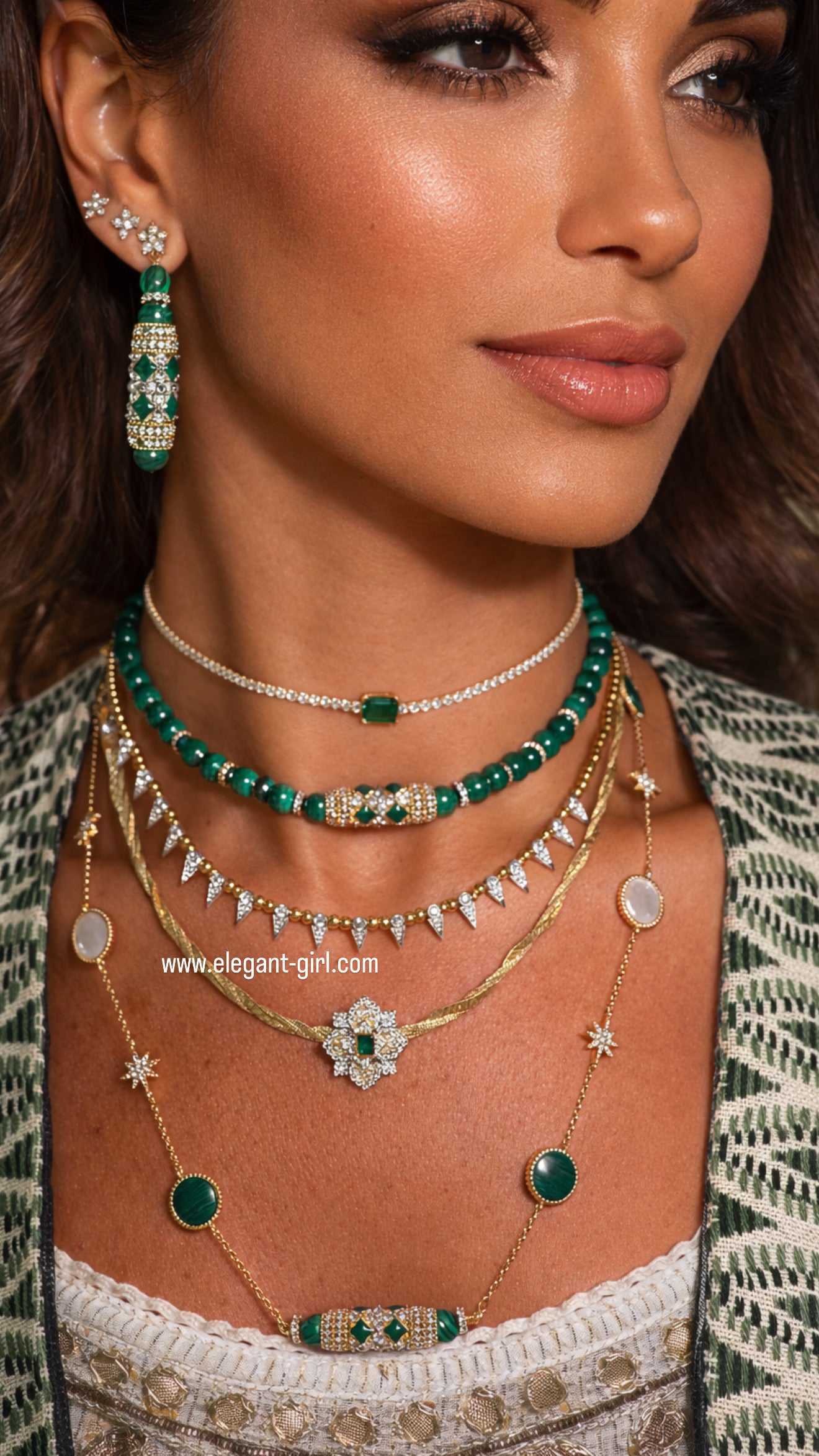 قطعة مجوهرات فاخرة مستوحاة من التصاميم الإيطالية الراقية، تجمع بين نعومة سلسلة Snake Skin الذهبية ولمعان الزمرد الأخضر في مركز تصميم نجمي مرصع بالألماس.