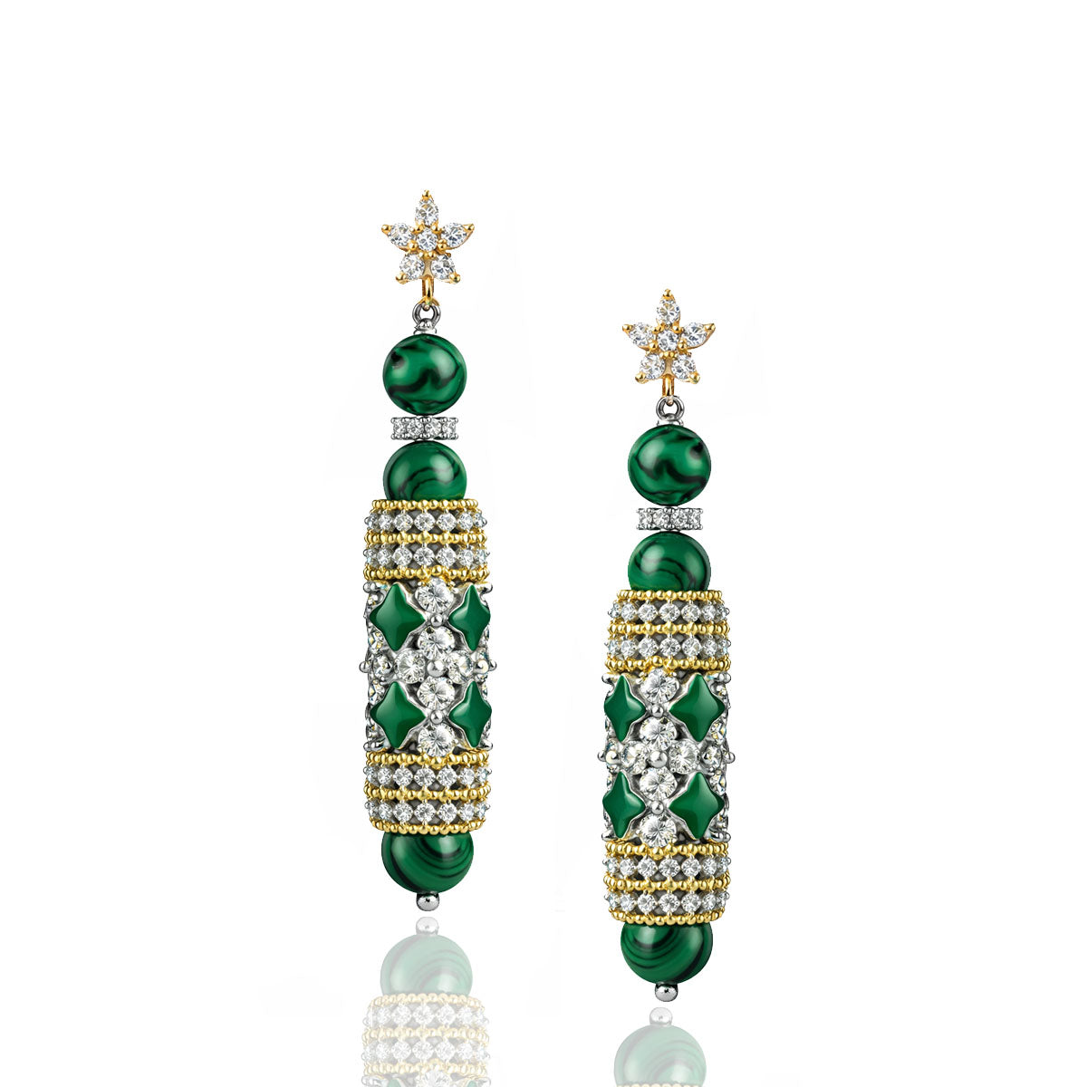 • 💚 Elegant long drop earrings featuring rich green stones and diamond-set details